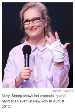 Ni siquiera la actriz Meryl Streep, ganadora de múltiples premios Óscar, se salvó de cortarse con el aguacate. A pesar de que interpretó a la chef Julia Child en una cinta, en 2012 se presentó ante medios con una herida en la mano.