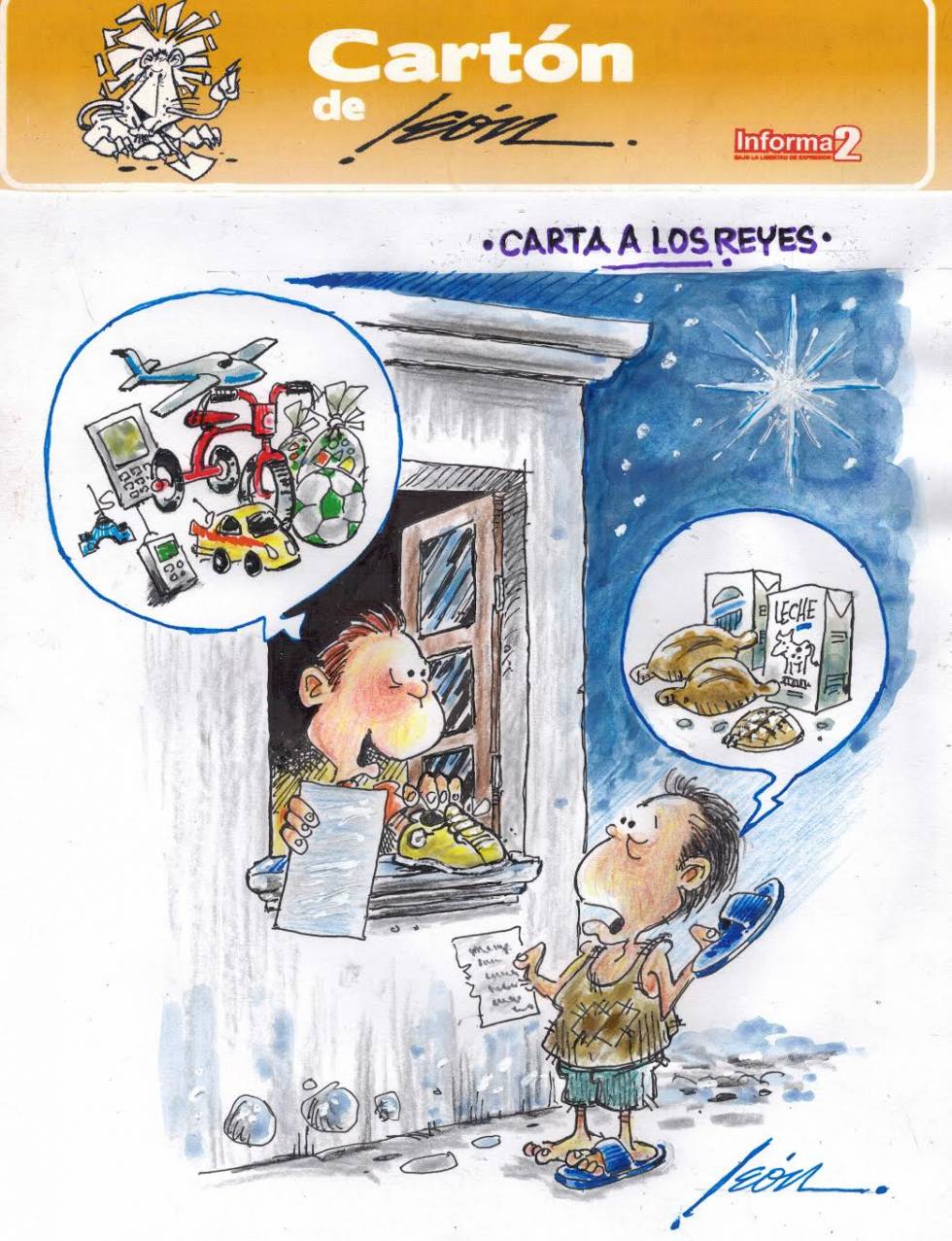 Pedro León | diarioalmomento.com Cartón: Carta a los Reyes Periodismo Enero 06, 2015 17:47 hrs. Periodismo › Pedro León › diarioalmomento.com Carta a los Reyes Ver más Sígue al autor facebook.com/diarioalmomento twitter.com/diarioalmomento
