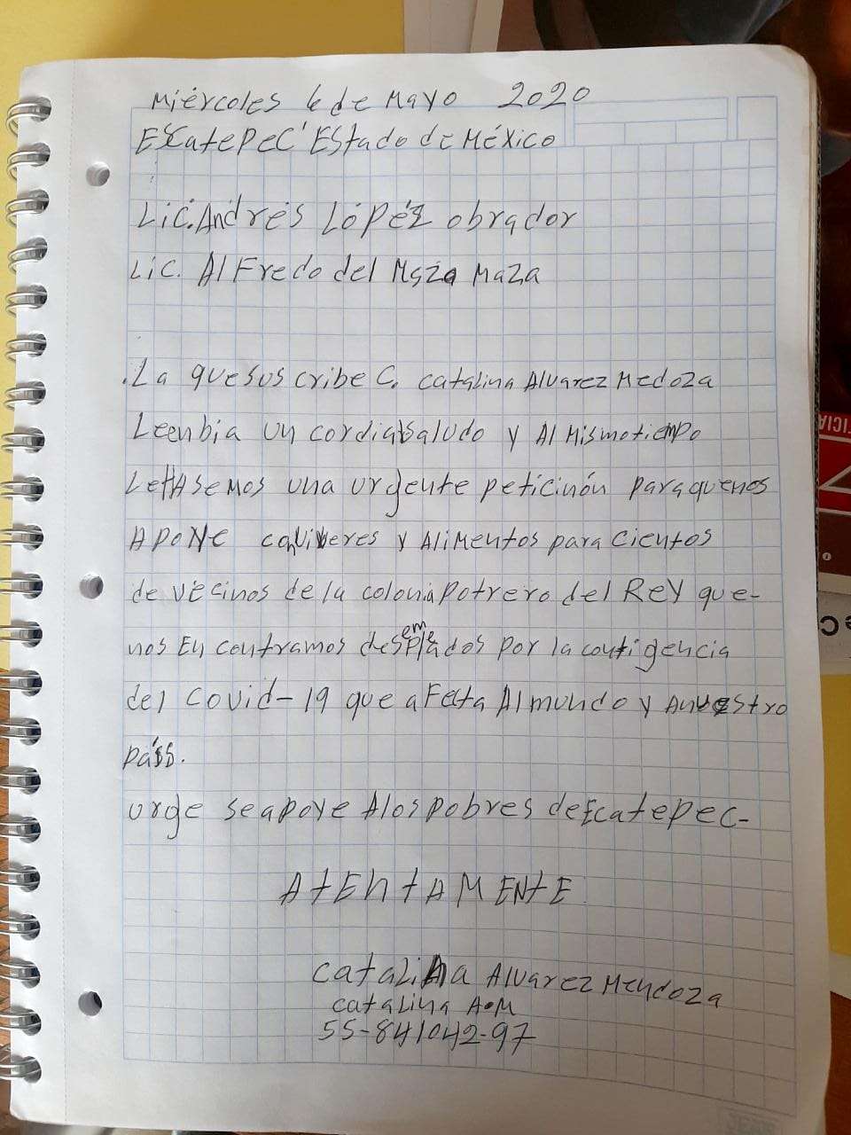 La que suscribe C. Catalina Alvarez Mendoza le envía un cordial saludo y al mismo tiempo le hacemos llegar una urgente petición para que nos apoye con víveres y alimento para cientos de vecinos de la colonia Potrero de Rey que nos encontramos desempleados por la contingencia del covid 19 que afecta al mundo y a nuestro país.