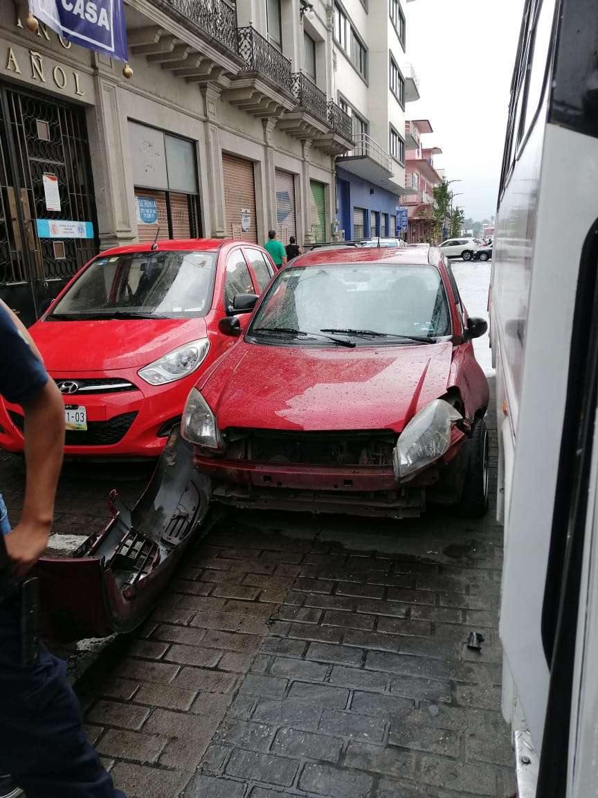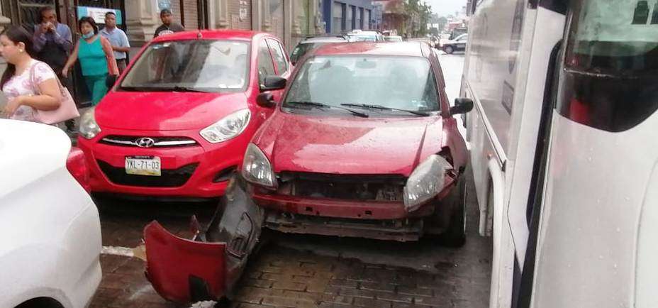 Se trata de un Chevy en color vino con placas de circulación YJX-910-A del estado de Veracruz, que al intentar salir de un cajón de estacionamiento realizó el corte de circulación a un autobús que circulaba sobre la calle 5 entre la avenida 1 y 3 del centro de la ciudad.