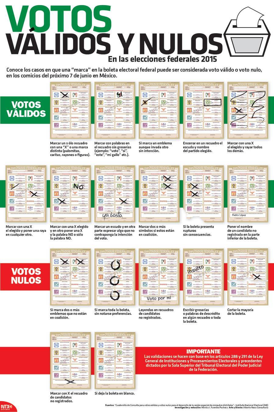 Esta infografía, realizada por Notimex, muestra 11 formas distintas, en las cuales un voto se determina como válido con base en los lineamientos que la ley marca. Además, muestra los casos en los cuales un voto se determina como nulo.