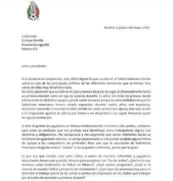 Tras advertir que no es ajeno a lo que sucede en su país y menos después de jugar tanto en Primera División como en Liga de Ascenso durante 12 años, denunció en una carta fechada en Madrid, España, el 1 de mayo, y dirigida a Enrique Bonilla, presidente de la Liga Mx, calificándolo de ’soberbio y arrogante’: